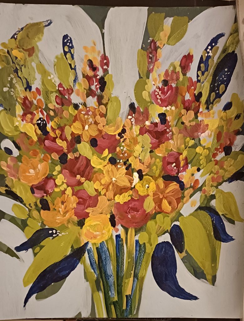 I dedicate my painting with a bouquet of flowers at mother’s feet seeking her blessings .