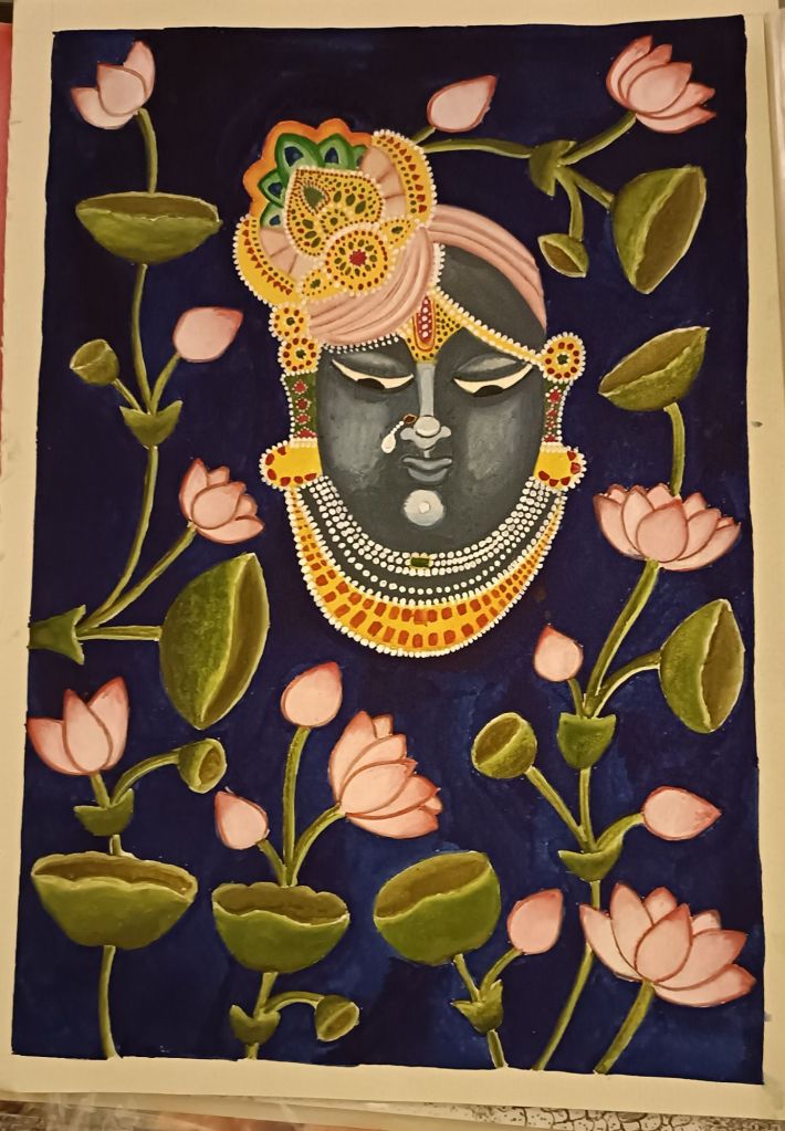 Lord Krishna shreenathji pichwai(pichvai) is a style of painting that originated 400-years ago in the town of Nathdwara udaipur Rajasthan depicting tales from Lord krishna’s life an attempt made by me to capture shreenathji’s grace.
